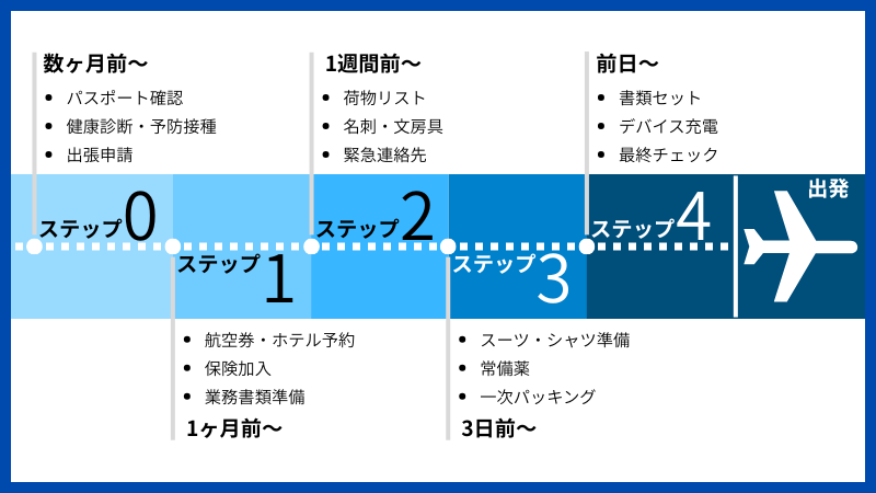 海外出張は、直前にまとめて準備するのではなく、出発までの時期ごとに分けて少しずつ進めるのがコツです。